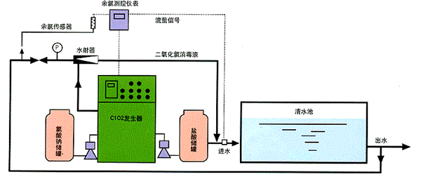 采用鹽酸與氯酸鈉定量注入到反應釜內,反應釜在加熱的情況下發生化學反應生產二氧化氯與氯氣,再通過水射器吸入投加到消毒水體中。工藝采用負壓曝氣、正壓注入的技術來生產二氧化氯消毒液。