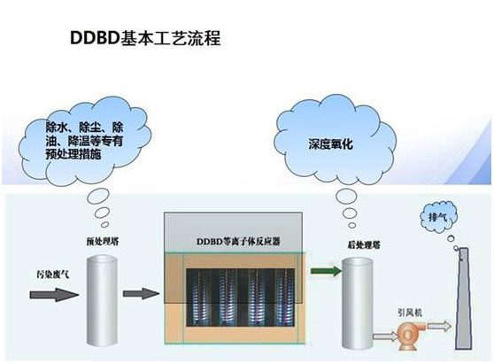 低溫等離子體技術處理污染物的原理為:在外加電場的作用下,介質放電產生的大量高能電子轟擊污染物分子,使其電離、解離和激發,然后便引發了一系列復雜的物理、化學反應,使復雜大分子污染物轉變為簡單小分子安穩物質,或使有毒有害物質轉變為沒有毒害或低毒低害物質,從而使污染物得以降解去除。因其電離后產生的電子平均能量在1eV~10eV,適當控制反應條件可以實現一般情況下難以實現或速度很慢的化學反應變得十分快速。